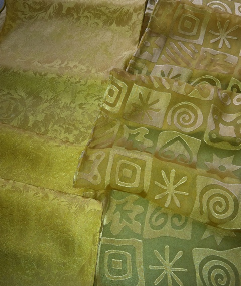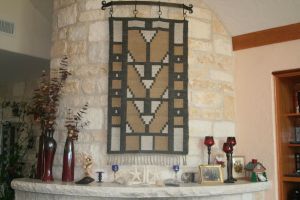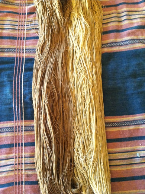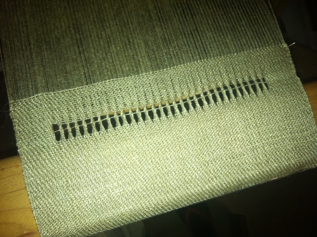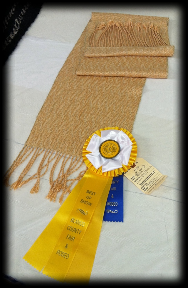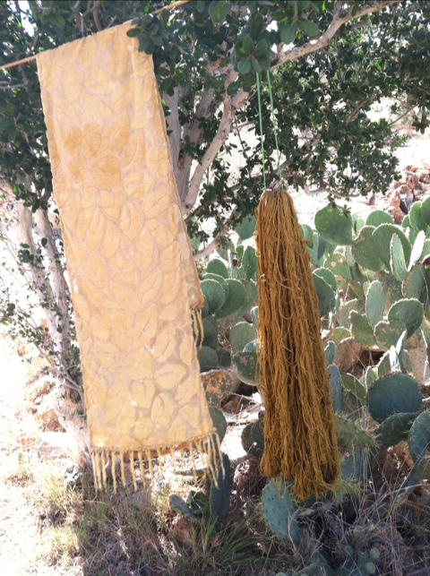 Here’s my sample scarf testing the material sett for weaving a larger shawl with my cotton/polyester dyed with Texas Ball Moss.