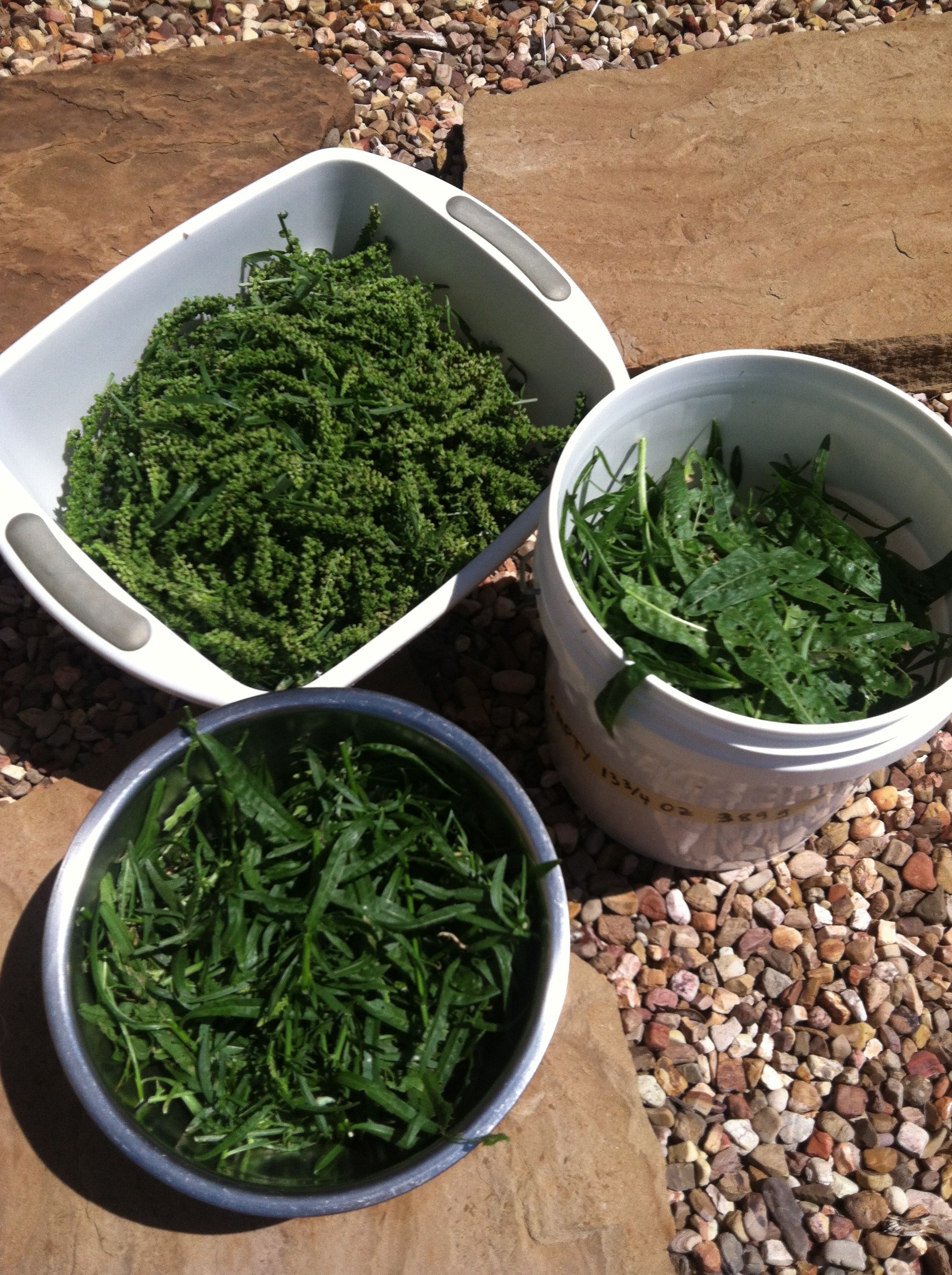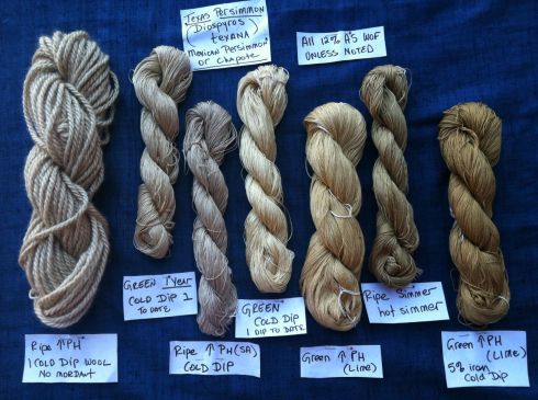 So far I’ve experimented with both the green and the ripe persimmon. I’ve experimented with increasing the PH, simmering the fruit and also aging the fruit. At this point it seems that the green fruit gives one a yellow toned color and the ripe fruit pushes towards golden brown. So far I have a 1 year old green vintage which I’ve tested with one dip. More to come on that one. I need to test with iron to see how that pushes towards black but last year’s experiment just gave me a golden brown. I am certainly getting a good variety of yellow, gold and amber colors. All will make great undertones for over dyeing. I just need to decide what to over dye them with….agarita, Japanese indigo, madder root, or lichen?