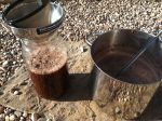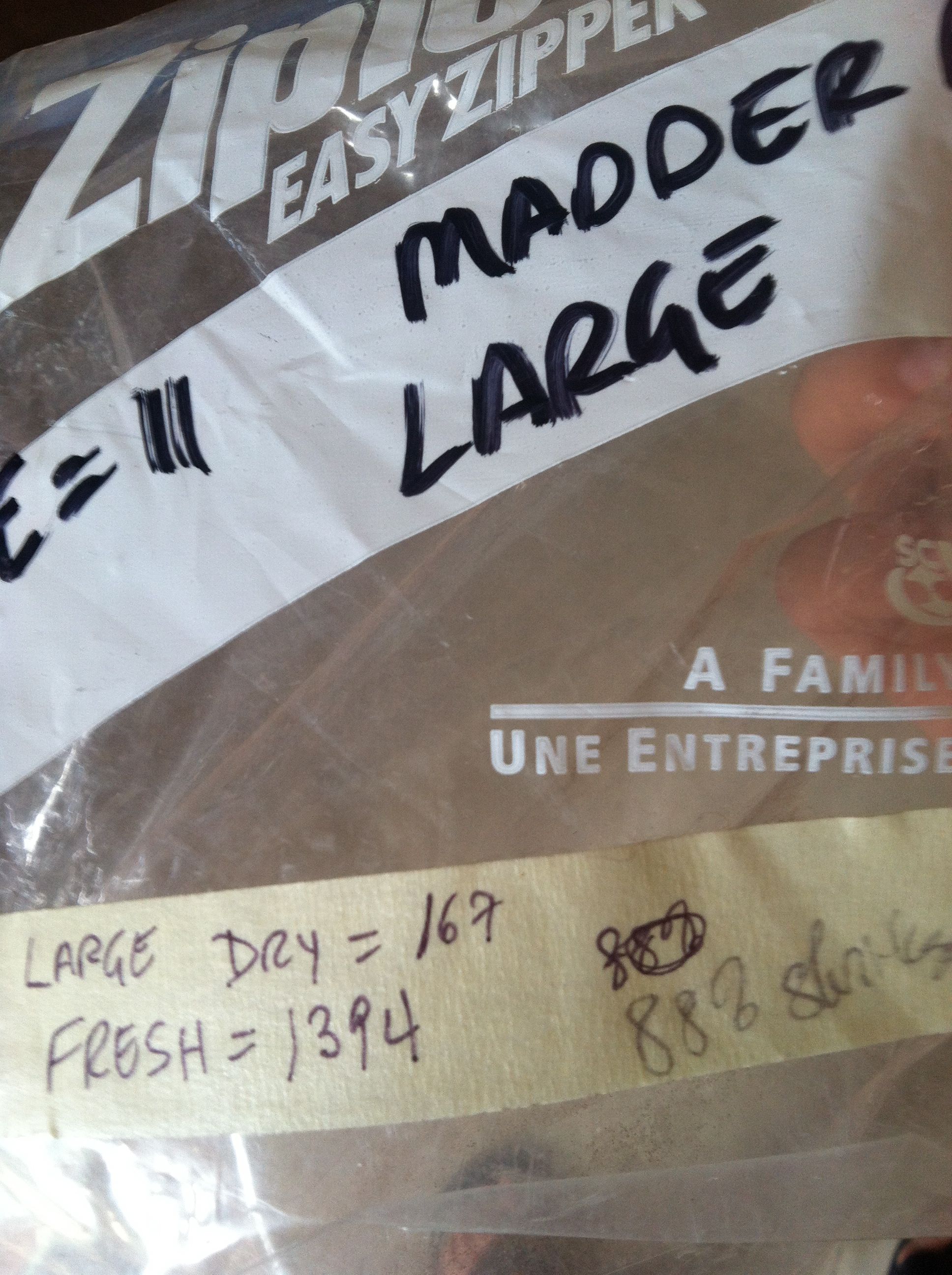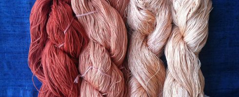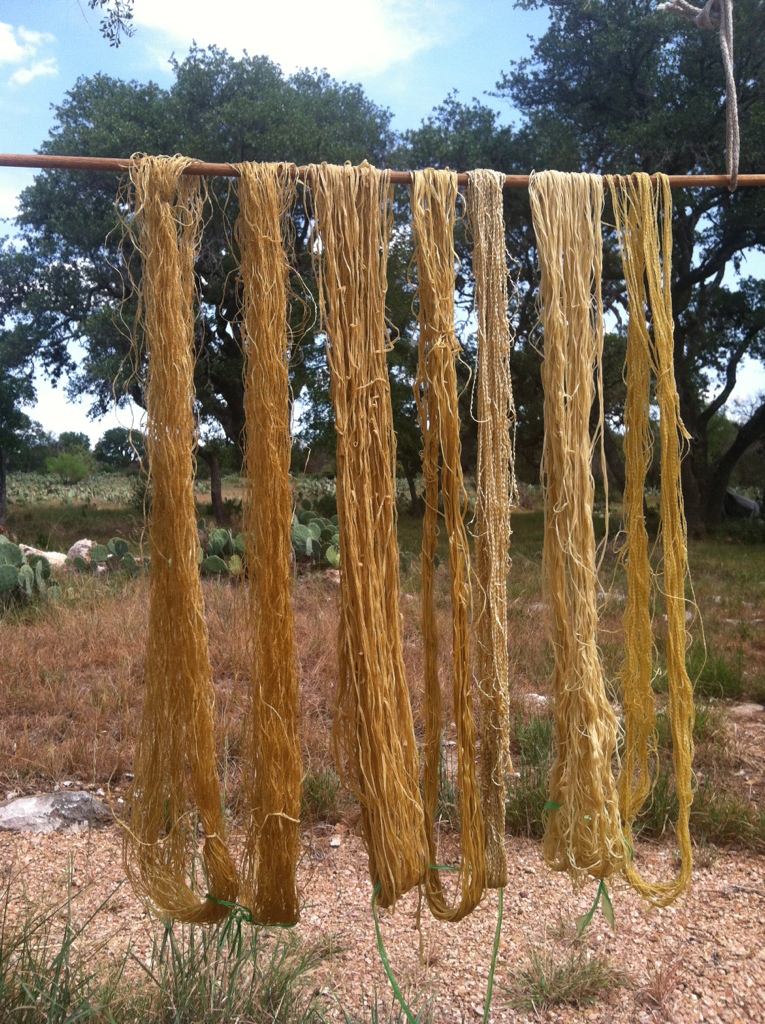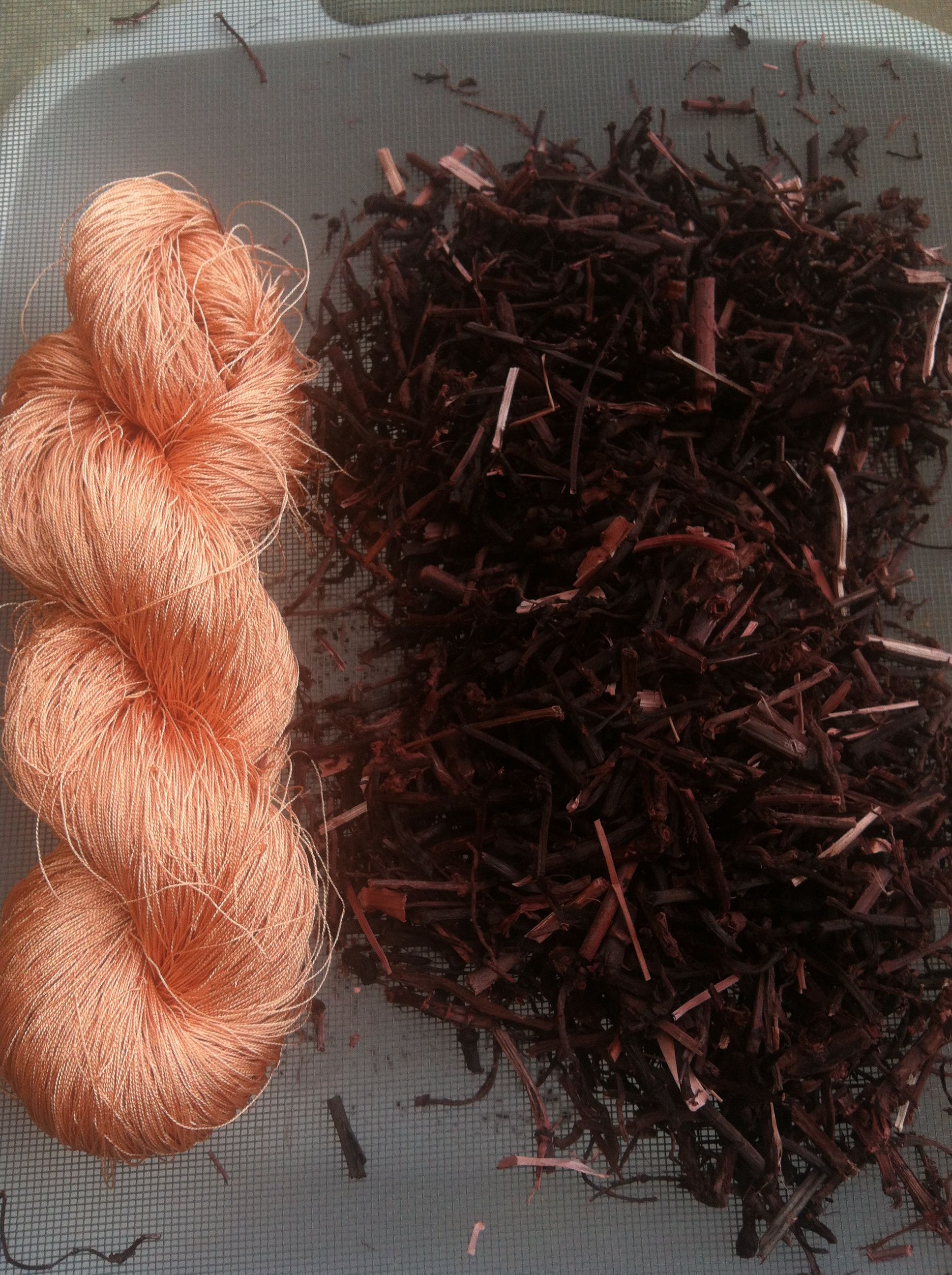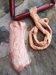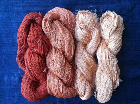 I have green samples of indigo overdyed with yellows but now I am trying indigo as the top color layer. The main experiment is overdyeing cold persimmon dips with some cota & lichen skeins thrown in. The cold dip persimmon (Texas Persimmon) appears below!