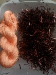 Hence the blender indigo as it doesn’t have the reduction chemicals and will impact the persimmon. Here are the wet skeins that are still changing over…definitely a different green when one flips the overdye. Will cure overnight and rinse tomorrow! The skein on the left is the lichen was a magenta.