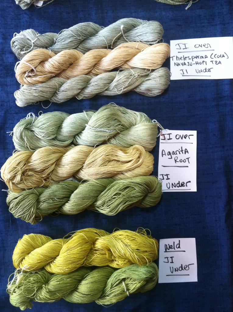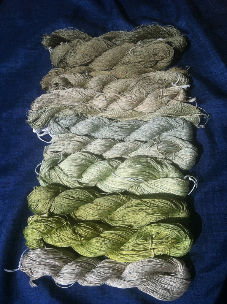 All of these colors were done with a minimum of dyestuff to see what I could get with a minimum of effort. Really, I am lazy! All are mordanted with alum sulfate at 12% wof, rinsed and cured for about a month before dyeing