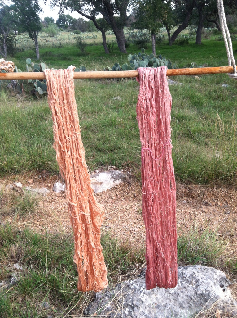 Below is my dye experiments with teloschistes exilis or slender orange bush lichen. It took over two years to collect 2 ounces of this windfall lichen plus one big damaging wind storm. The substrate is silk. I now know this process works as well on silk as well as wool!