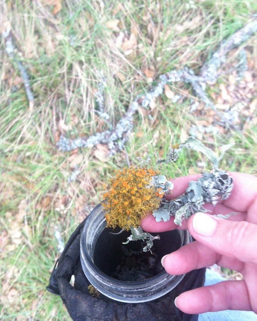 After 20-30 mph winds one day, marble size hail another day and a driving rain on a different day it is a great morning to harvest the windfall lichens. Especially with the am humidity and mist the lichen easily peels of the branches instead of crumbling in the dry weather.