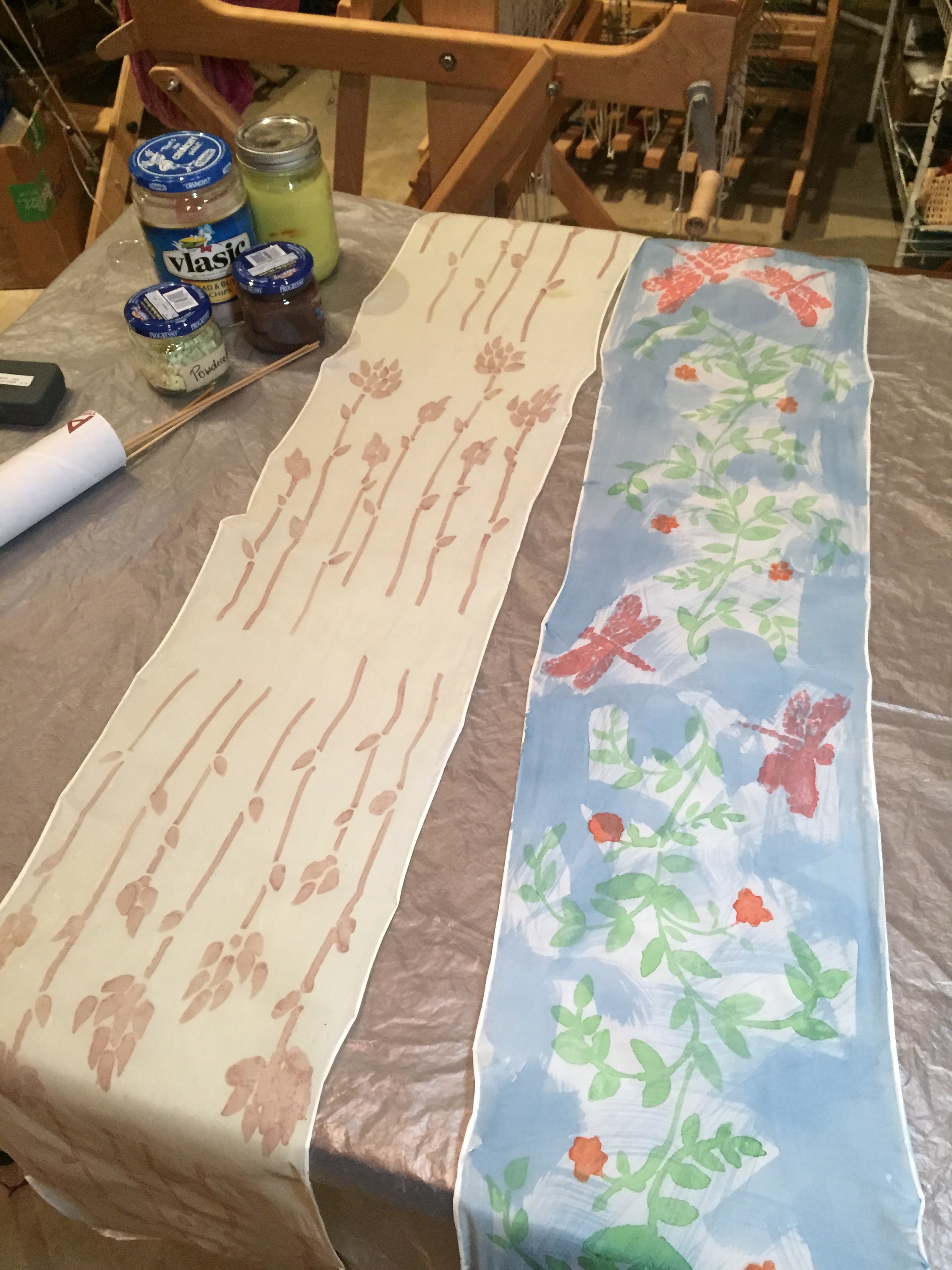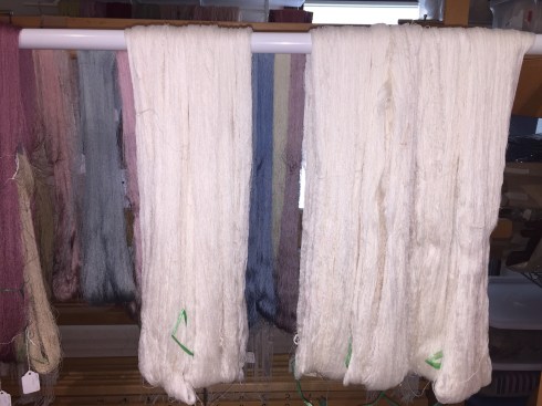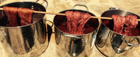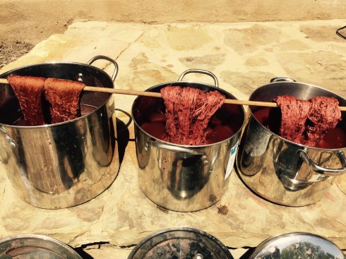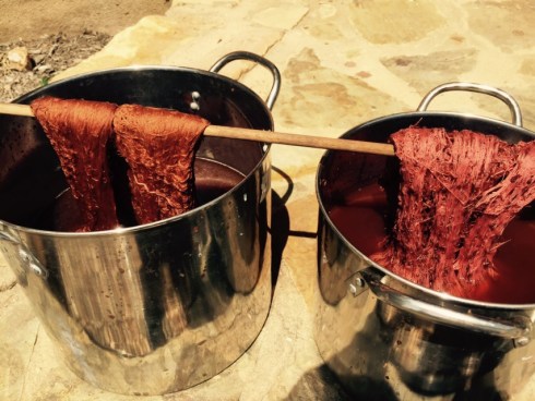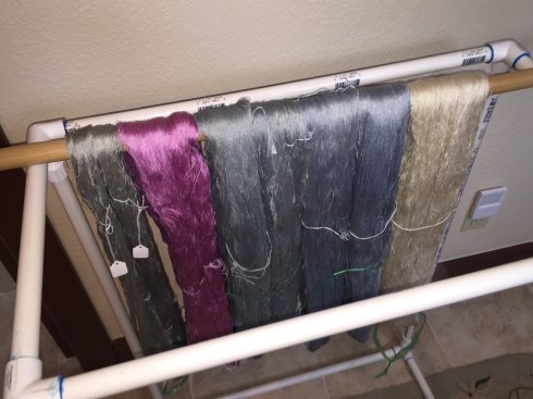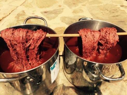 These skeins go back into the dyepot and will hang out in the sun for a couple more days to see what depth of color I can achieve. When fiber is wet it is usually a couple shades lighter when dried. I won’t leave them too long as I don’t want to weaken the silk.