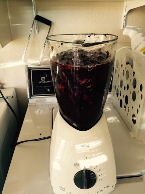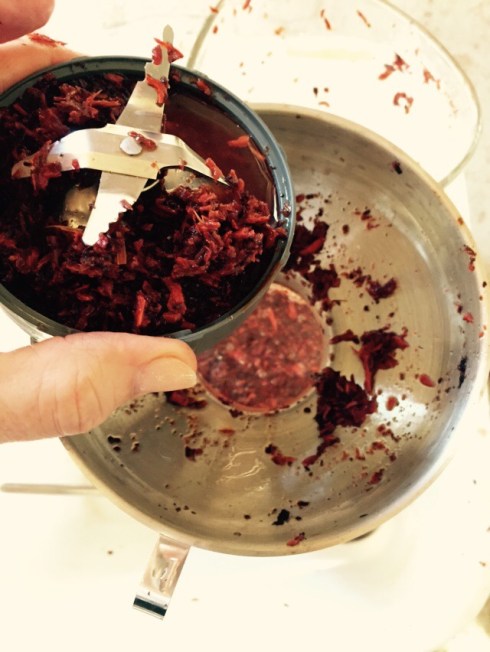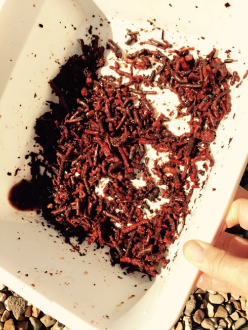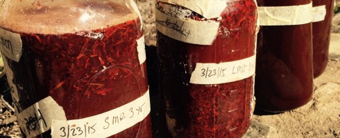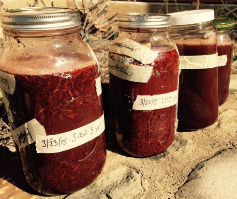 About a week ago I put aside 2 batches of 3 year madder root (small & large) to “cold” soak in our 80 degree spring weather here in the Texas Hill Country. Actually the water heats to about 100 degrees Fahrenheit. I checked it not trusting stone/sun overheating potential! If you overheat madder root the red breaks to a brown. Not desirable if one is trying for a red tone.