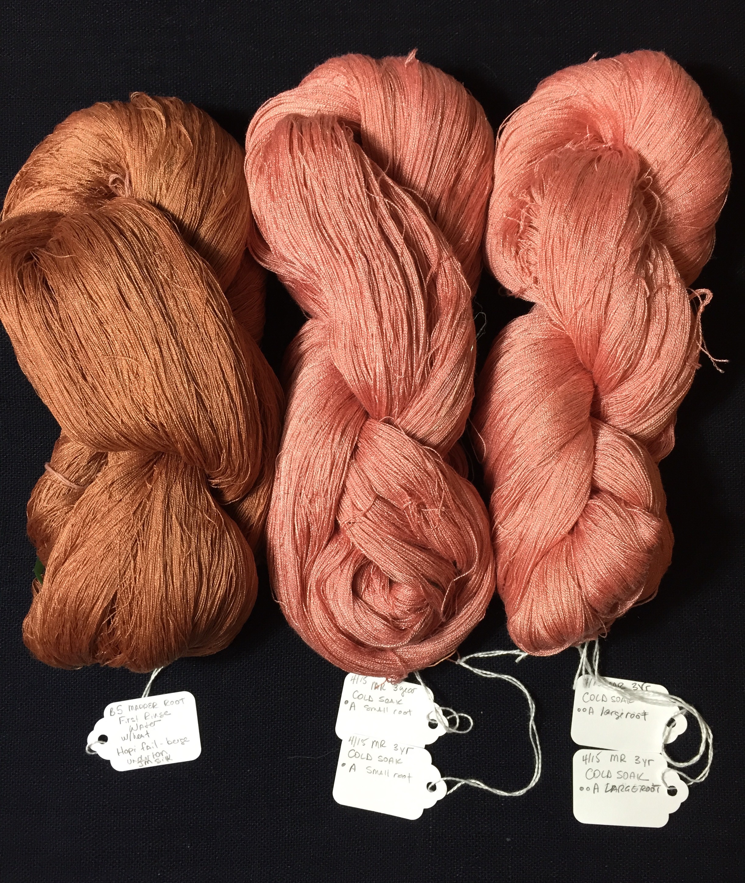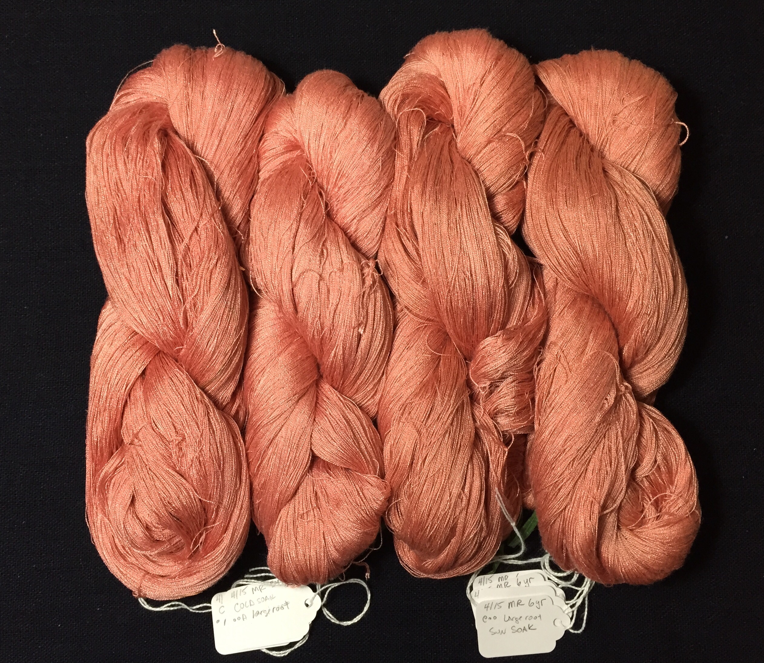So, in summary, the color extracted beautifully from the roots in the solar dye. The next round will be a heat pull to compare the 3 and 6 year roots. At this point the colors I got between the 3 year and 6 year madder root were not that different but because of the substrate snafu, I am holding judgement until I complete another color run.