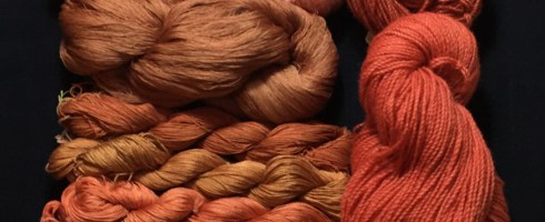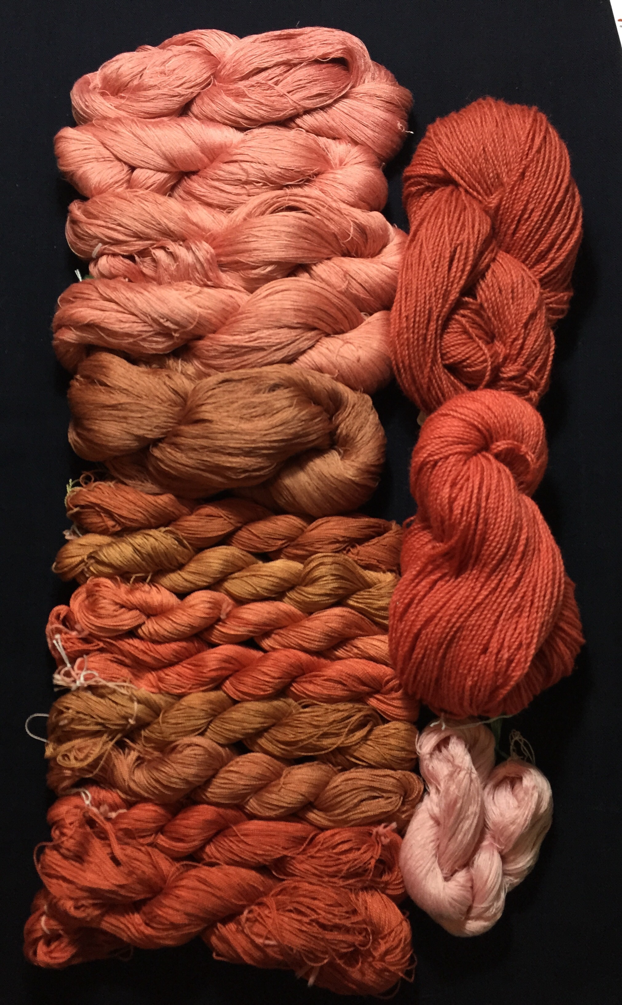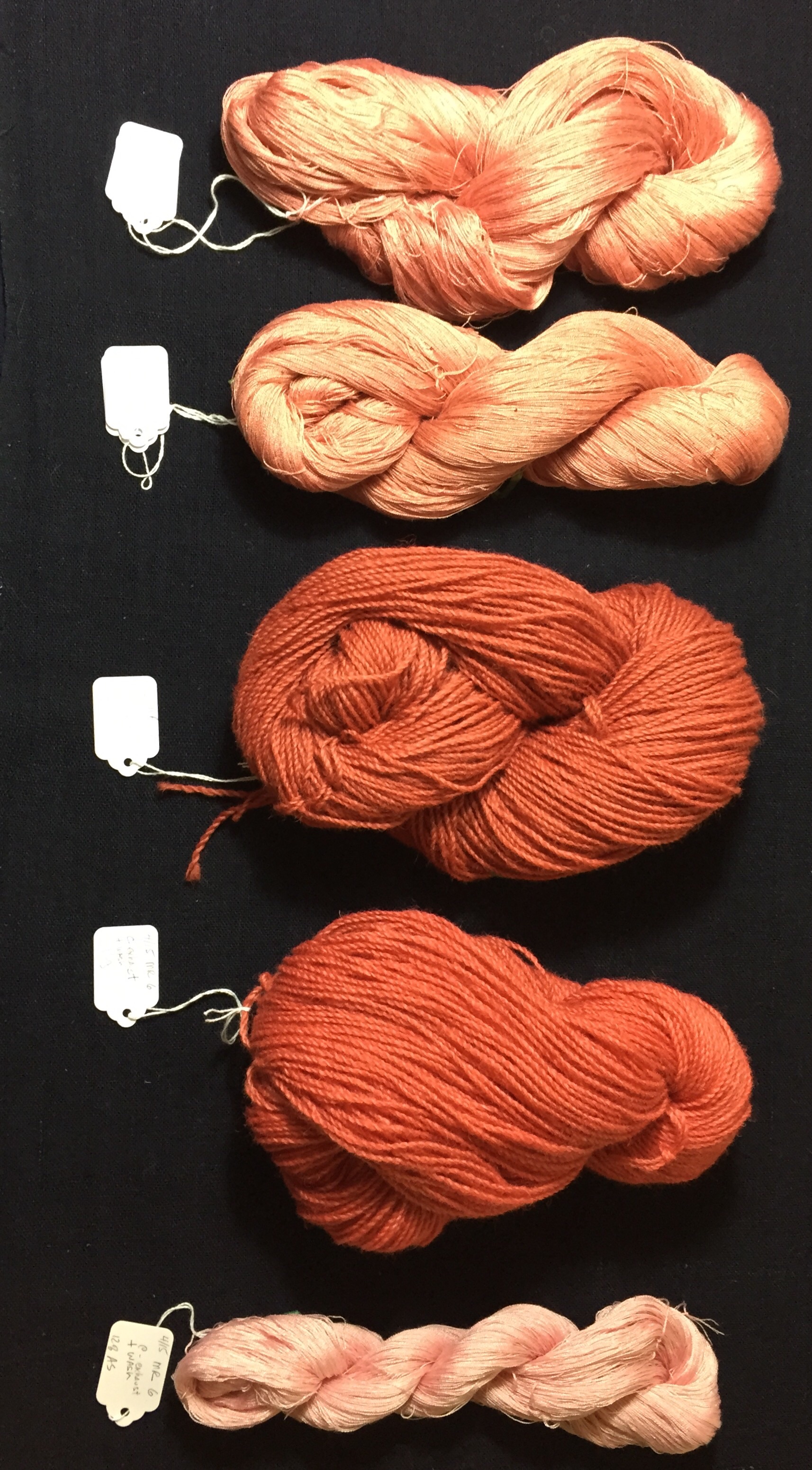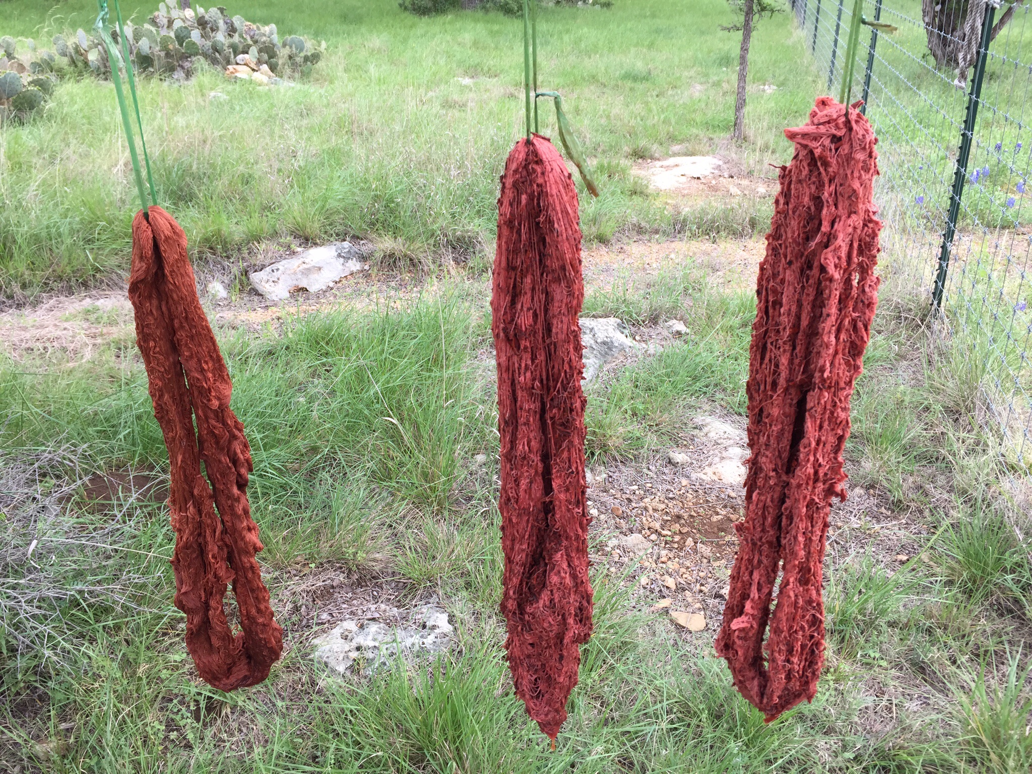 For a first run at madder solar color things were not bad….I got the orange and reddish oranges but no deep red. But the good news is there is more madder to experiment with. Let me be clear, I am very happy with the range I got from my skeins in the first round. There was a disappointment. Although I had flame tested a fiber, it tricked me into thinking it was silk. I used this yarn in the first pull of color expecting glorious deep color, the wet skeins promised it. The earlier madder harvest & prep journey is posted here.