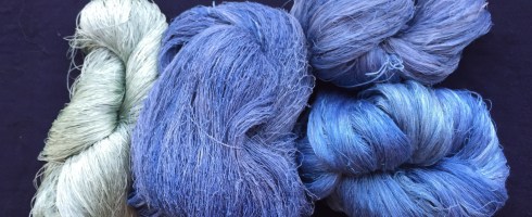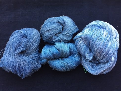 And the indigo suffruticosa yield this color in 2 dips after a thio extraction. The skein on the right was a leftover larger skein which I put in to exhaust the extracted bath. It will go back into the next indigo bath to darken it. I did many other skeins. I’ll update my leaf to substrate ratio for this bath when I am near my notes. One of the things to remember when you are leaf dyeing over the growing seasons is that your skein might revisit baths over the growing sesson in order to build color layers.