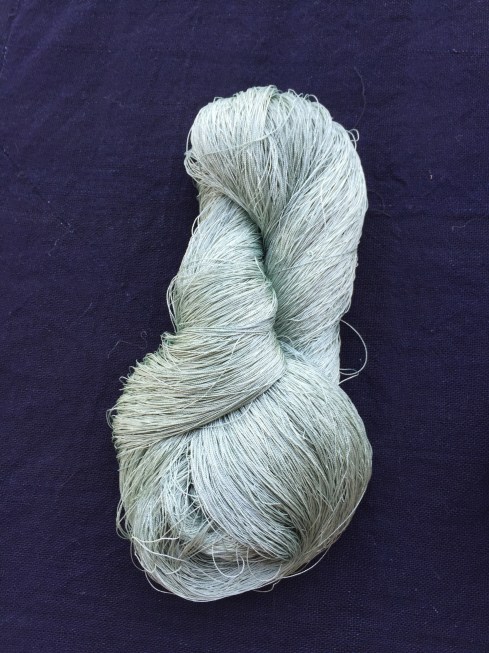 4. Finally the color, I had friends over to do Japanese Indigo blender dye scarves and had plenty dyebath left over. I had a mordanted silk skein on hand and left it in the dye bath. A beautiful mint green resulted, not sure my camera registers the color well. It is deep mint green.