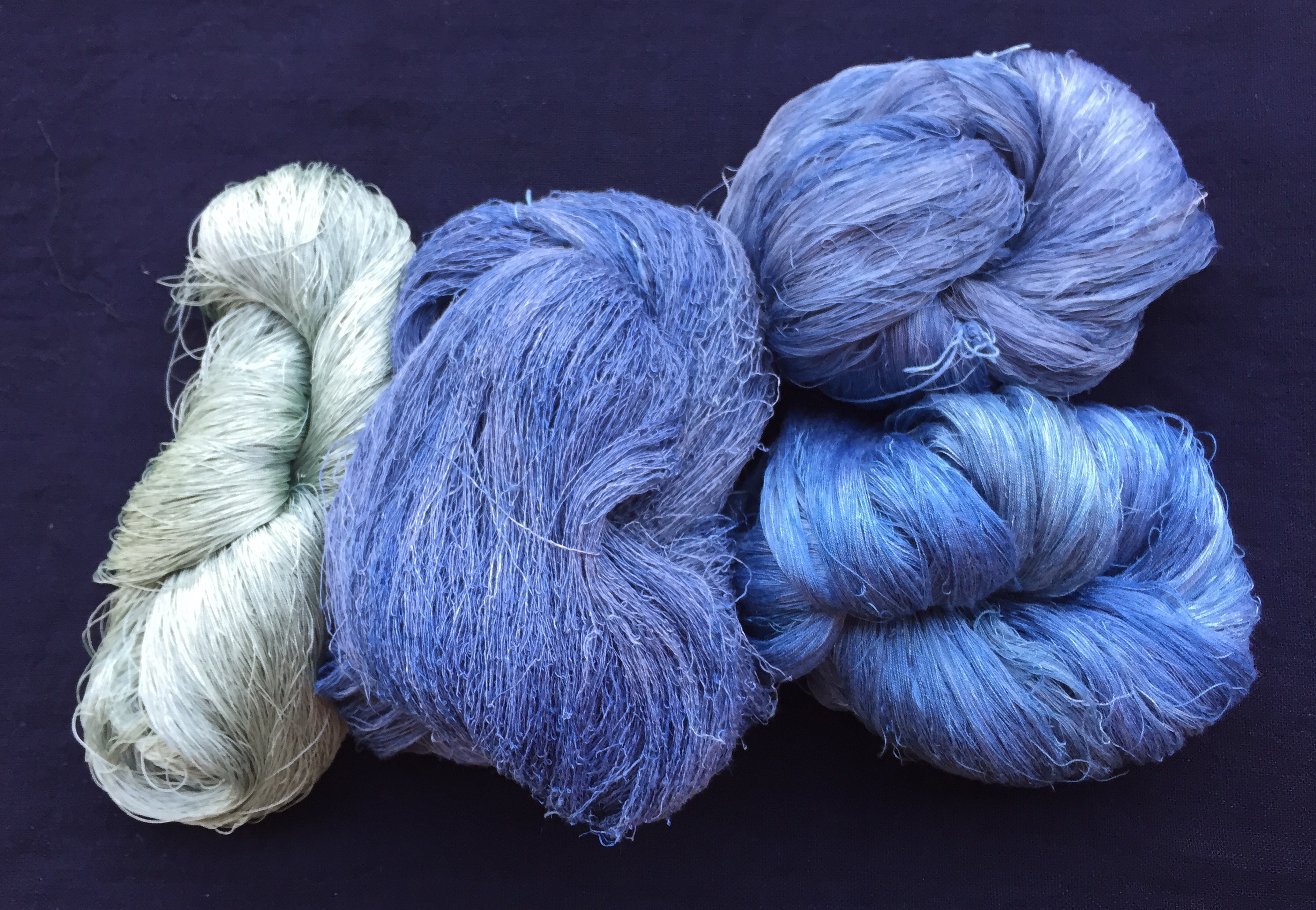 And the indigo suffruticosa yield this color in 2 dips after a thio extraction. The skein on the right was a leftover larger skein which I put in to exhaust the extracted bath. It will go back into the next indigo bath to darken it. I did many other skeins. I’ll update my leaf to substrate ratio for this bath when I am near my notes. One of the things to remember when you are leaf dyeing over the growing seasons is that your skein might revisit baths over the growing sesson in order to build color layers.