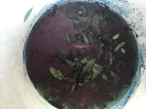 When you pull a seed bunch a branchlet usually comes with it. Determined not to waste an opportunity I’ve put these branchlets plus some wind trimming into a white bucket and put it aside to see if my indigo makes a natural appearance. Look at this after just one day!