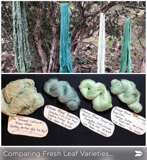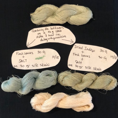 My experiments are below, a reminder that this works with this species of Japanese Indigo because of the beta enzyme that causes the indigo to bind with the protein fiber. It is a short-lived enzyme so one must work the material quickly before the benefit dissipates with exposure to oxygen.