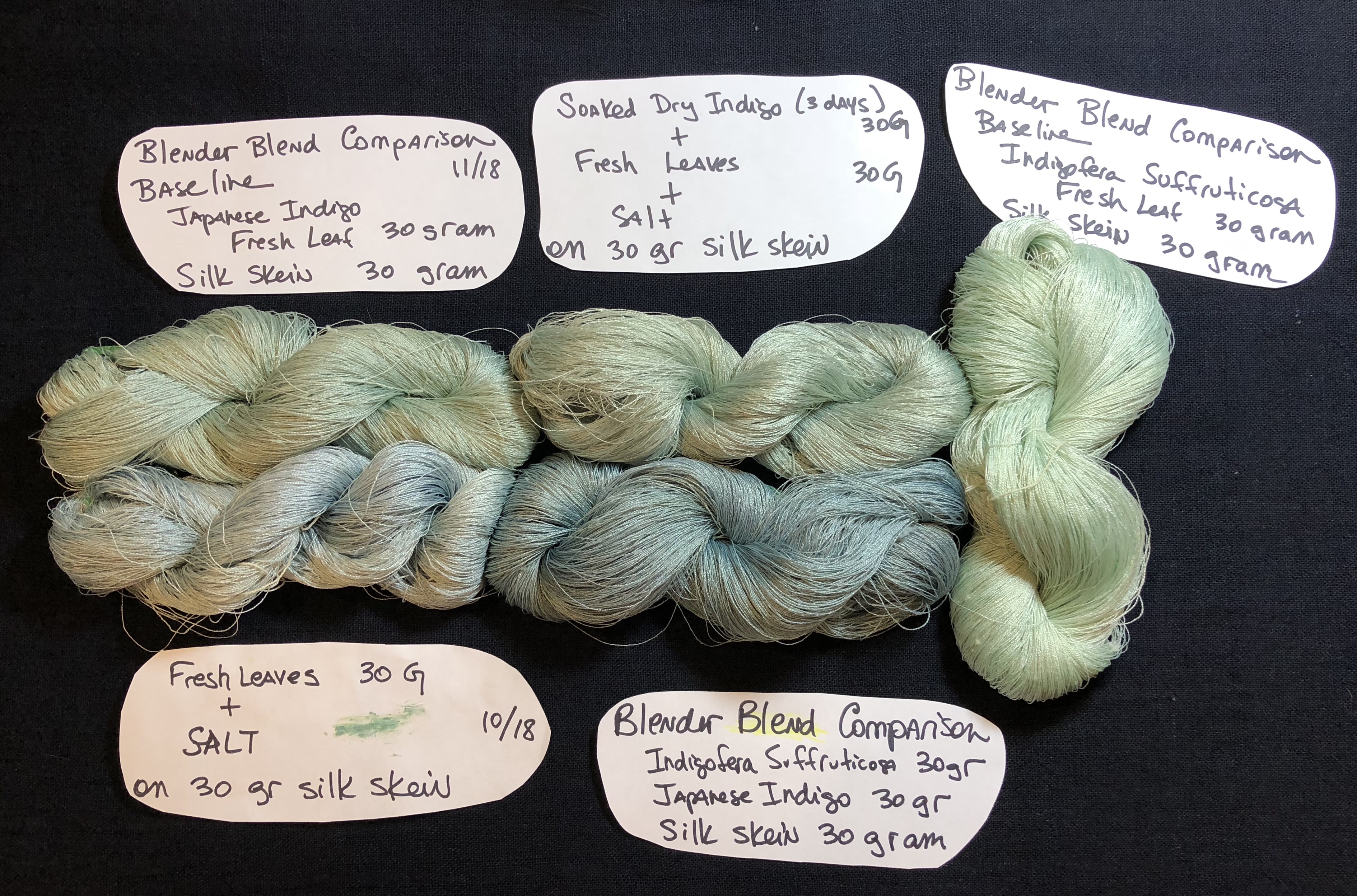 Below are my results with appropriate labels. I did use tight spun organize silk sourced from Bhutan. My control amount was 30 grams since that is what my prepared skeins weighed. My personal impressions are: