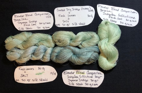 Fresh/Soaked Dried Leaf Salt Rub – keeping in mind that straight dried did not work with the kneading, I tried soaking to soften the leaves. I soaked 30 grams of my dried leaf for a couple of days to break down the cells and added that mush to my fresh leaf mush. This soaking did not yield a darker blue than my control skein. Overall it was fun to try this experiment but in my region I just cannot grow enough Japanese Indigo to take advantage of this rubbing method.
