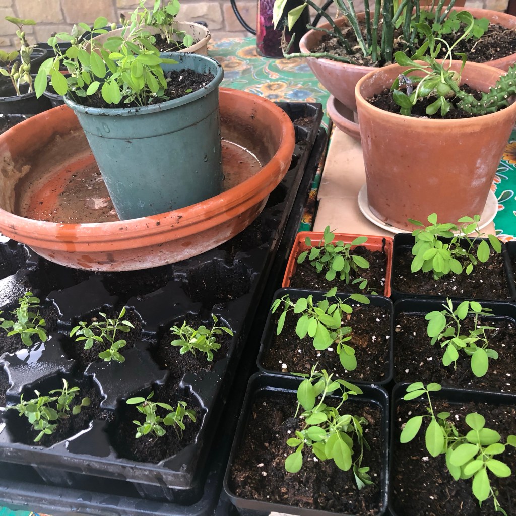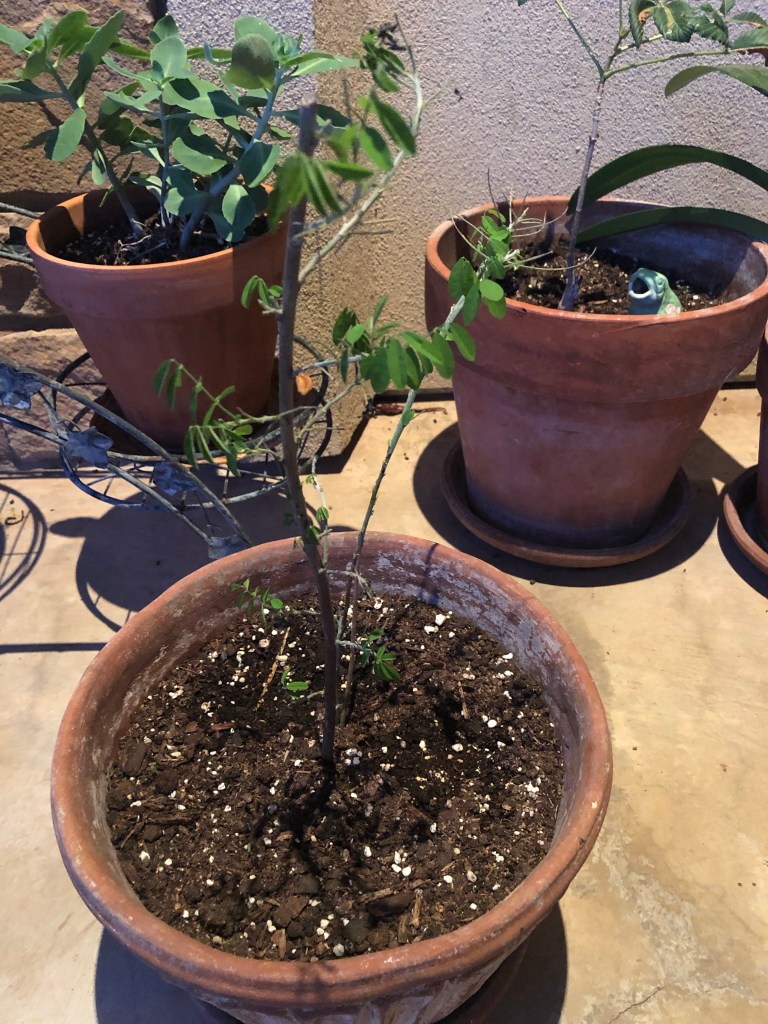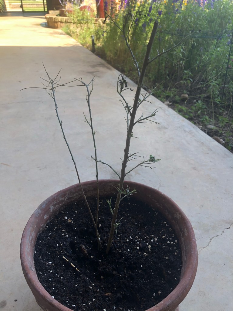 And for those who remember my sad plant ravaged by caterpillars, it lives. Transplanted to a pot and spoiled for a couple of weeks the leaves are making another appearance. This will go back into the ground soon. It still looks sad but with the increasing warm temps and a permanent home in the ground it will thrive.