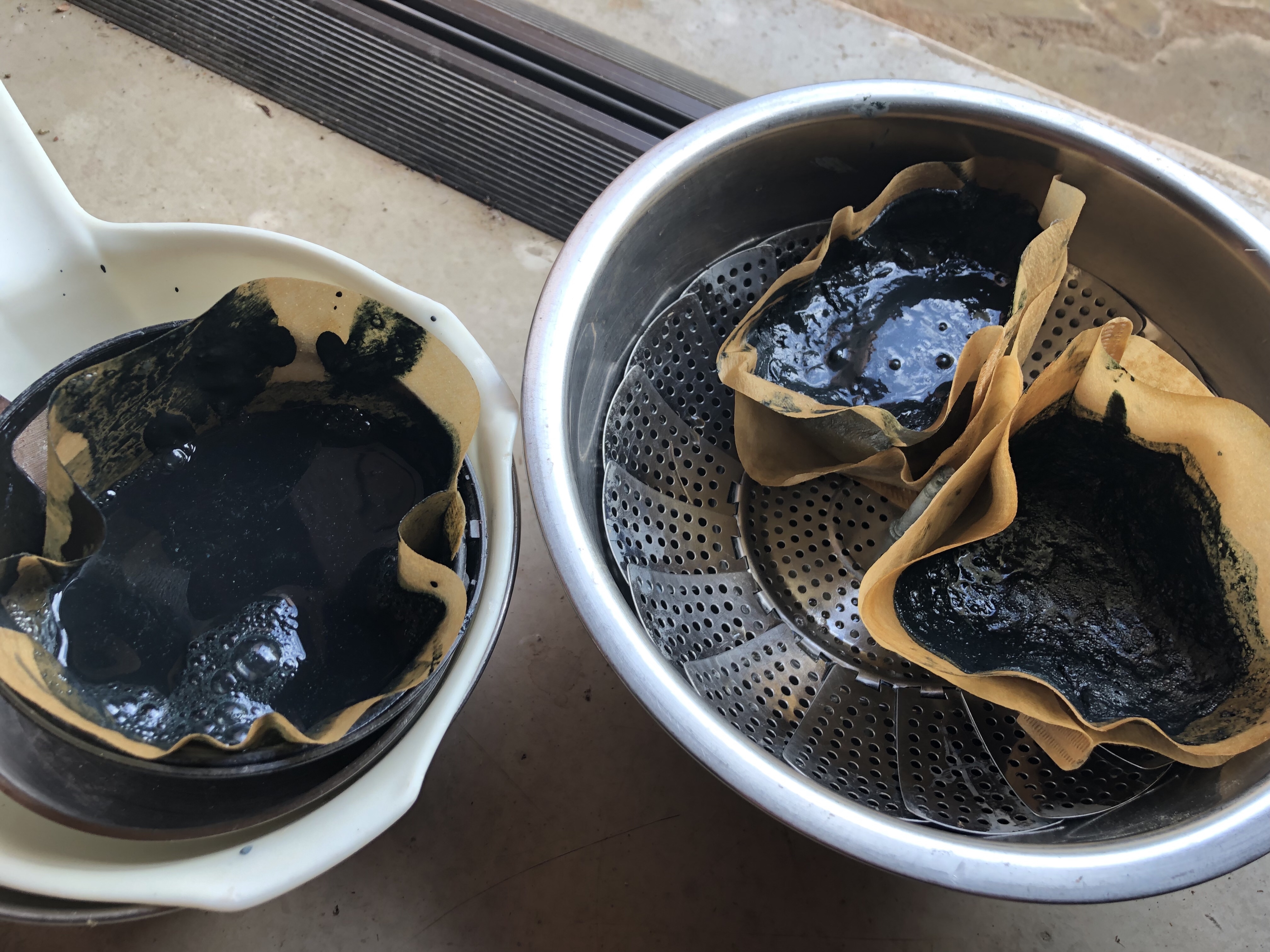 The kicker in the wet “measuring” process is the calcium hydroxide used to flocculate the indigo and get It to settle for filtration. Despite trying several methods of just using water settling the indigo, my observation is that this method takes way too long for the indigo to settle to a useable filtration state. Using the calcium hydroxide is much more efficient for me and enabled me to get on with the process and my life outside of indigo. But, the 4-6 tablespoons of calcium hydroxide added for flocculation adds weight and one cannot get a clean measurement of just pigment. So I investigated washing my pigment with 9% vinegar to cleanse it of the calcium carbonate which the calcium hydroxide inevitably becomes when mixed with water and oxygen. Leaving it as paste just adds to bulk and one must always add more slaked lime to reactivate the indigo chemistry to get the bonding. Plus washing reduces the sludge. I have heard mutterings that the vinegar washing impacts the indigo paste but I have not found anything in writing. Folks do wash only with water, next time I will try that against a vinegar wash and compare.