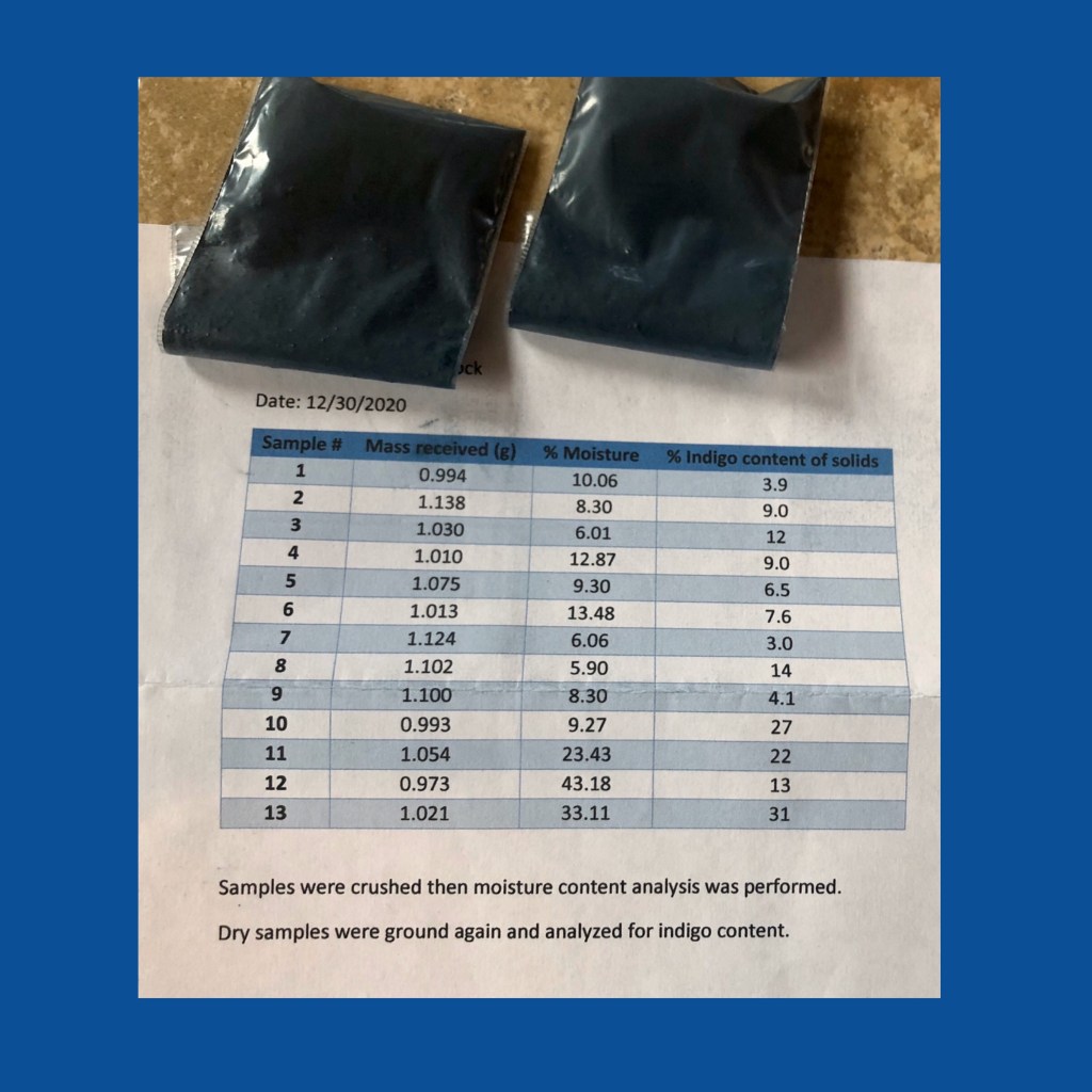 Response from Summer Arrowood, Senior Research Chemist, “Your samples were quite moist, as much as 43% water in the case of #12. In order for our analysis to work the samples must be very dry. I dried the entire sample on a moisture balance and then took the dry material and analyzed it for indigo content. The ‘Indigo content of solids’ refers to this analysis. To get the ‘overall % indigo’, I used the moisture content and the indigo purity to calculate the % indigo of the sample as you sent it, including the water mass.”
