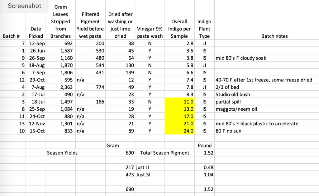 I’ve added my growing notes in the chart below in addition to the testing performed by Stony Creek Colors on my samples submitted. Chart is sorted by Indigo per Sample yield but I’ve included data to show you the seasonal cycle. The late season results were surprising. I was happy with the seasonal yield although it does include 4 batches that did not get washed to remove the calcium carbonate. I included the weight of pigment before washing and after washing. Towards the end of the season I had committed to washing with vinegar on all my batches and felt what I had measured earlier in the season gave me info I needed to see the difference. I calculated the the reduction in volume stored was about 80-90%.