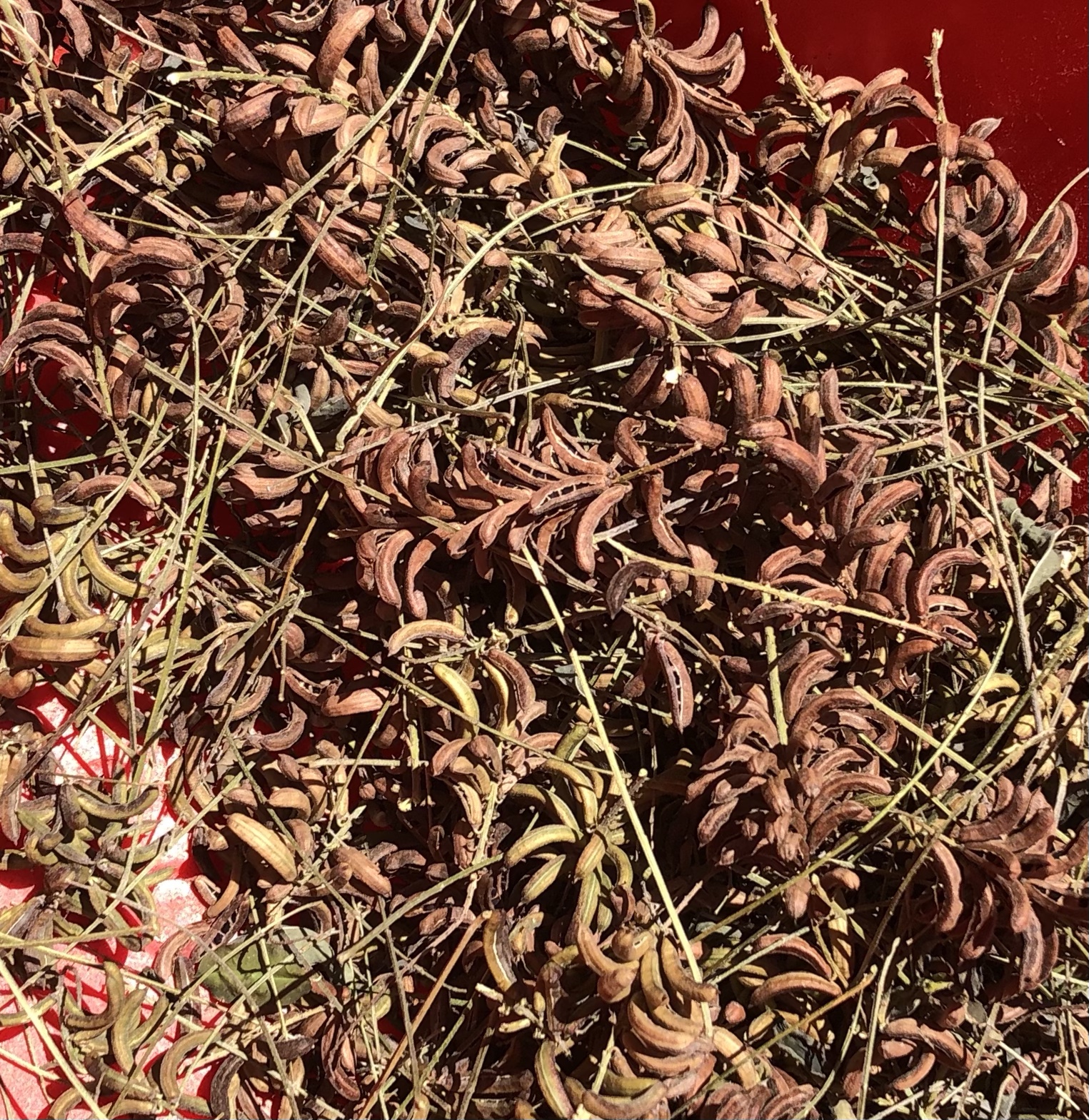 These seed branches were put aside in a wheelbarrow in a protected area and allowed to continue to ripen and finally to freeze/dry. The freezing took out the bugs and made the pods easier to snap off to dry further.