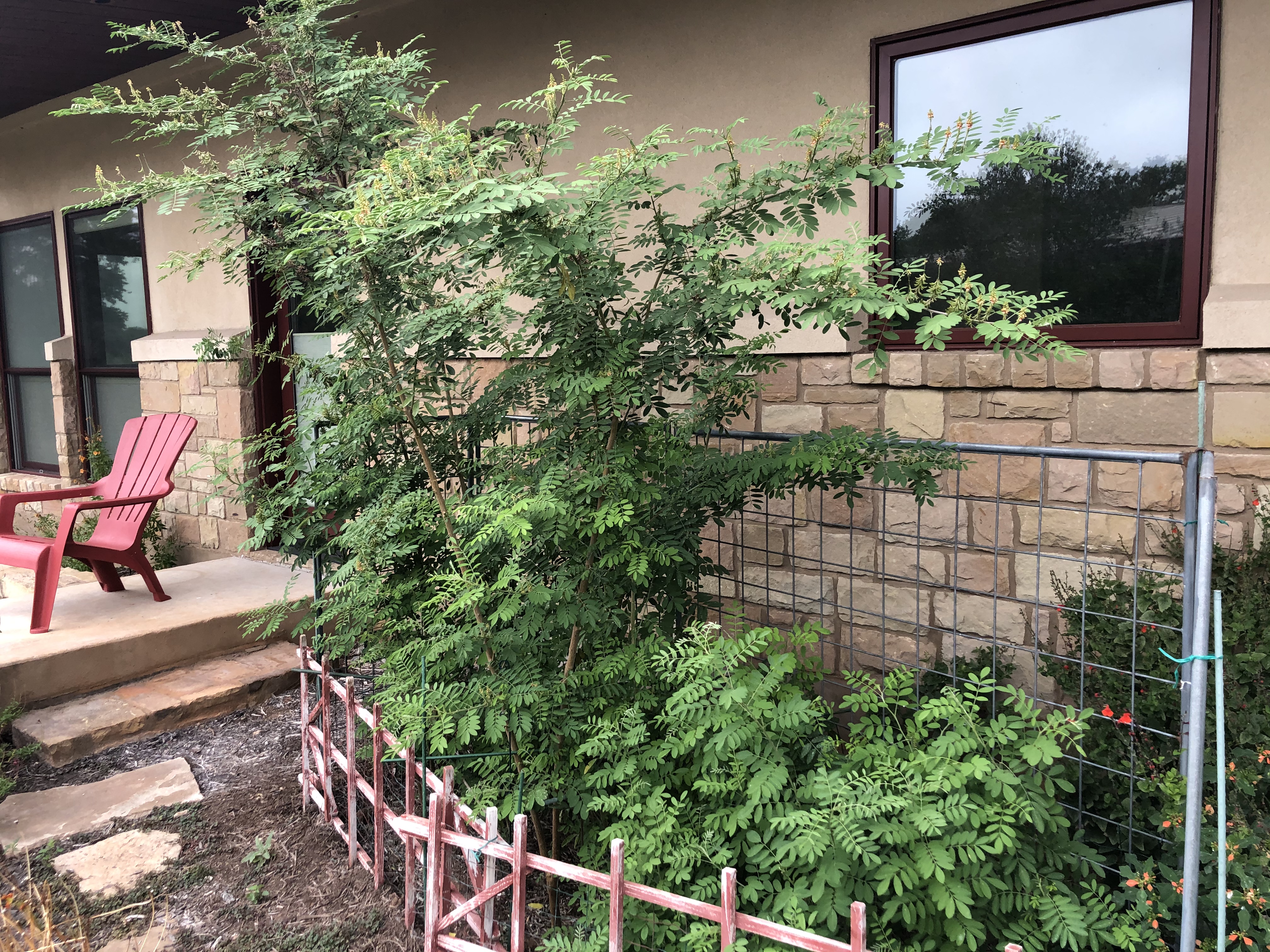 I do have one survivor sprouting against the wall “outside the fence”. See behind the dead shrub? This is a good time to show the difference between the Lindheimer’s Senna that grows wild here and the Indigofera Suffruticosa. They look very much alike in the teenage stage but there is a small appearance difference. The Senna has double leaves on the stem tip. The Suffruticosa has a single leaf. Subtle but significant when you are making a decision on what to pull and what to leave in place. And no, the senna does not yield blue.