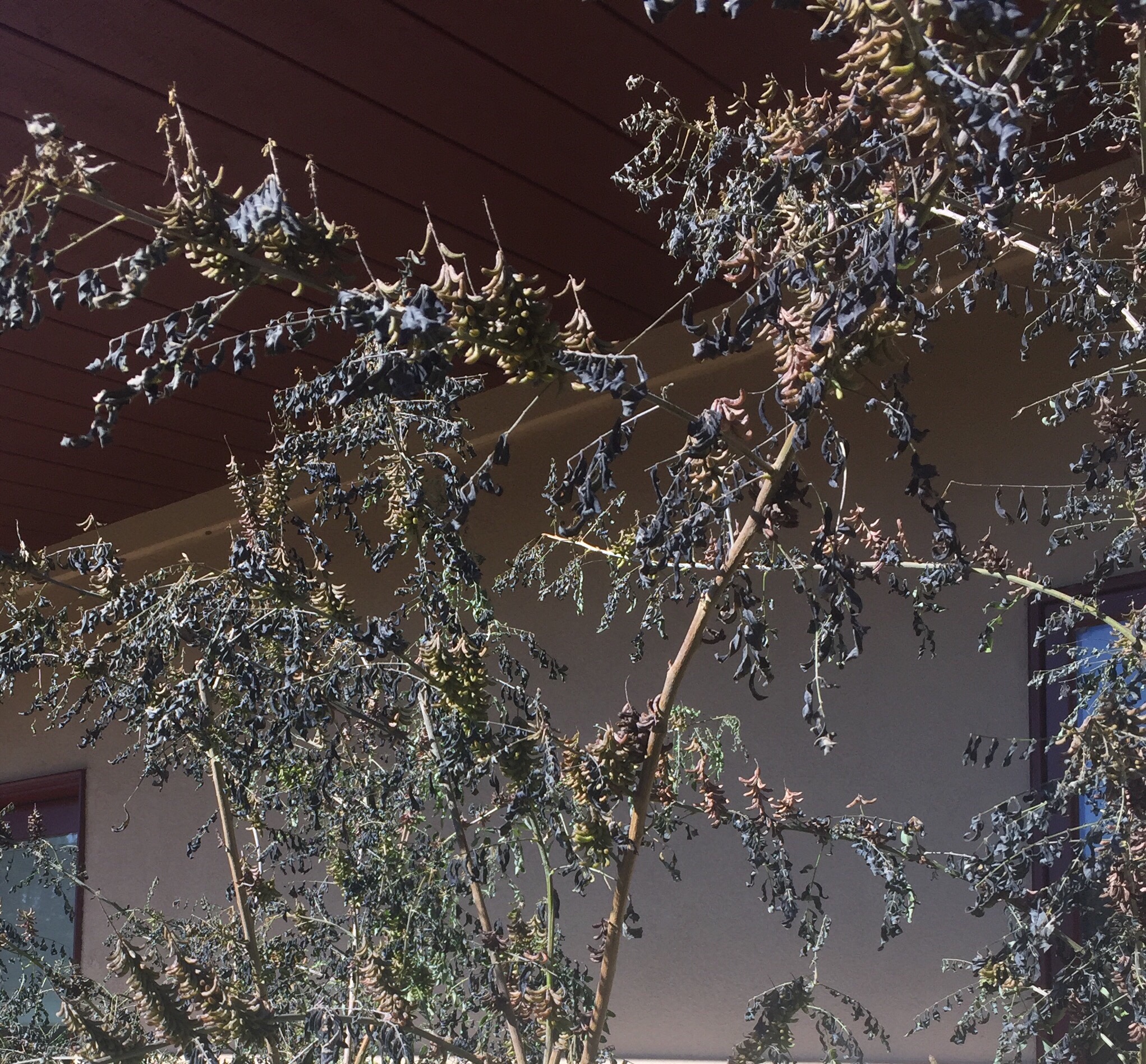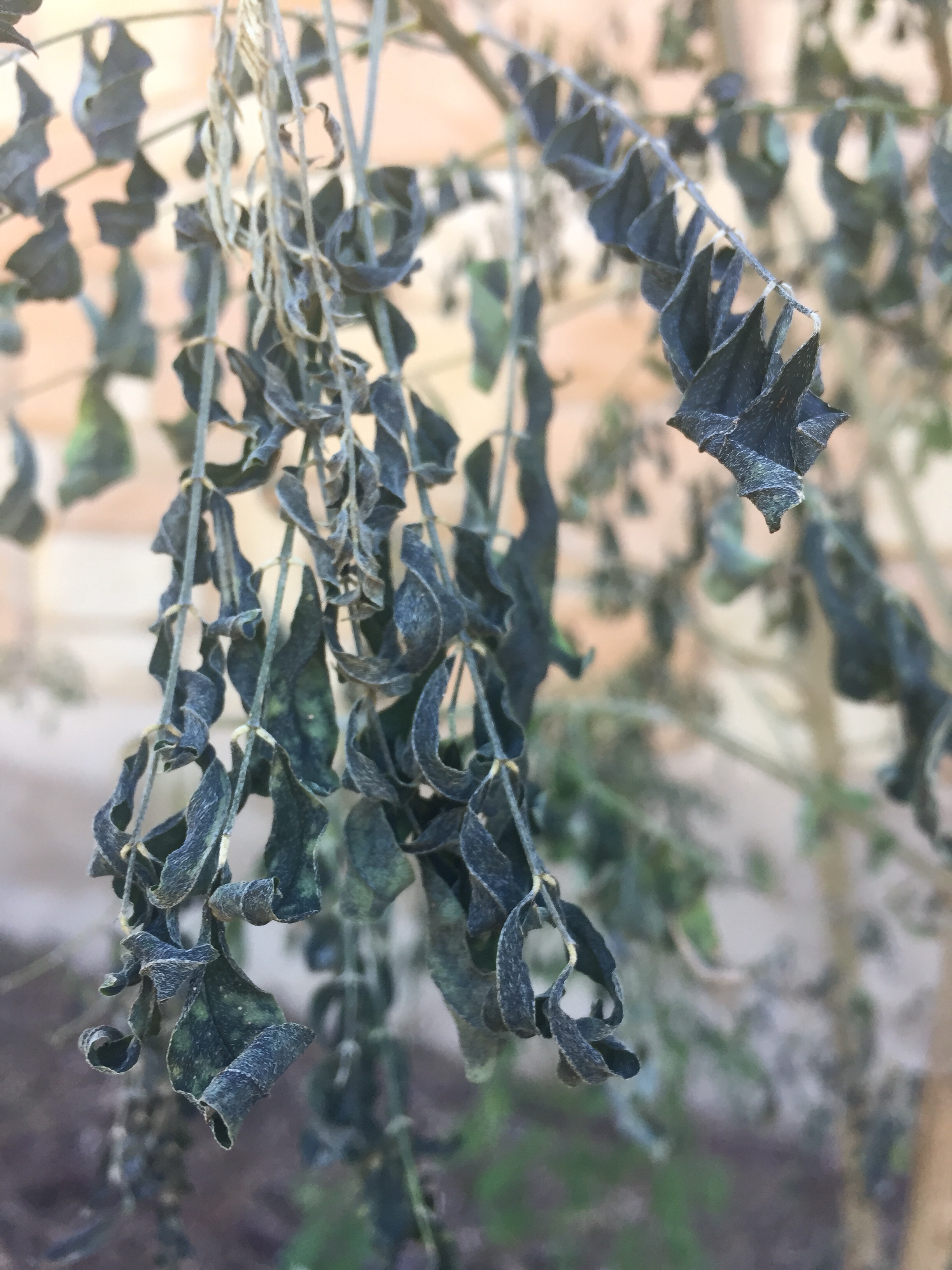 After the great Texas blizzard of 2017 the remaining frozen indigo needs some attention. You can see how much indigo remains in the Indigo Suffrucitosa. I will pick and strip them before the winds take them down for me.
