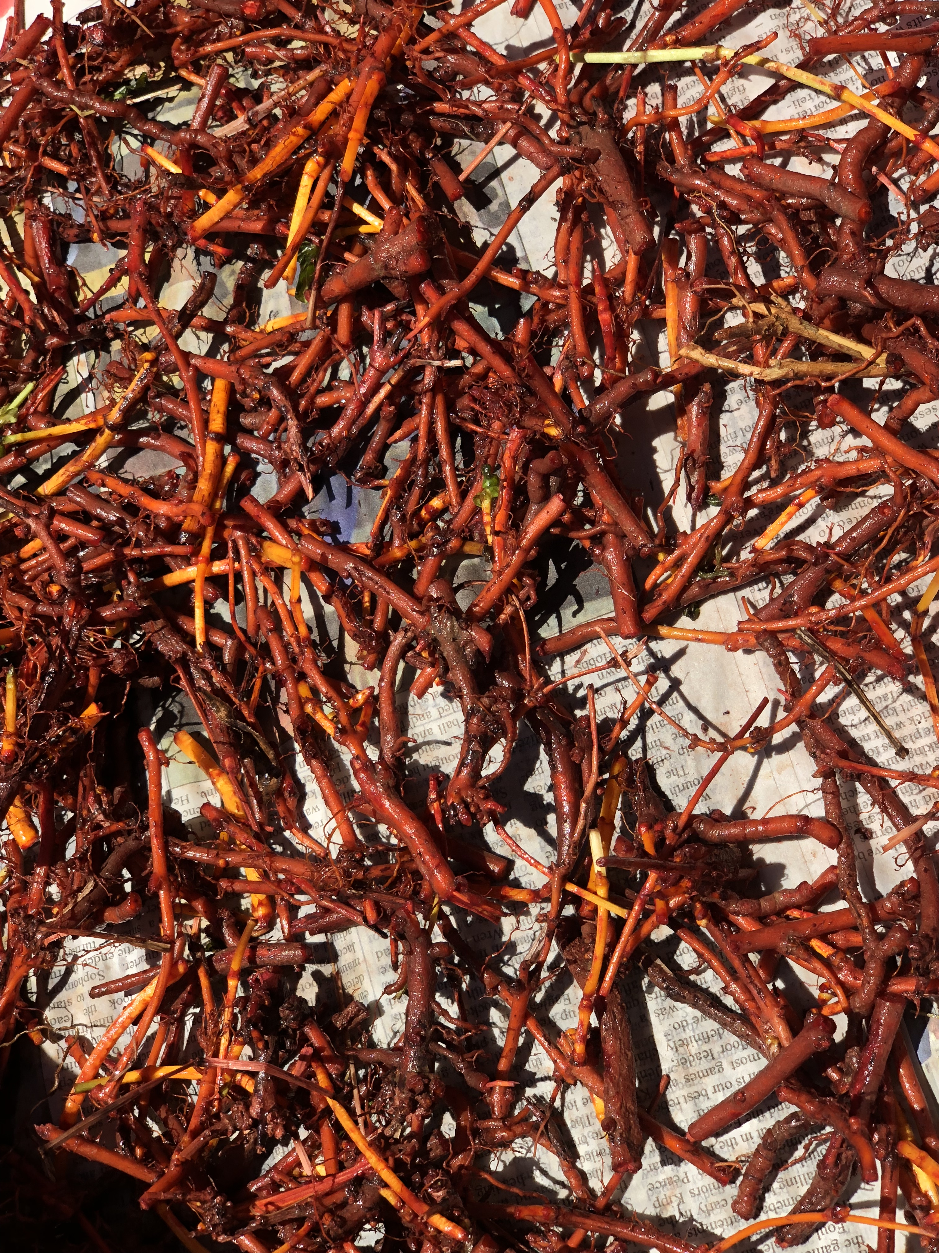After getting rid of the muck I rinse a final time and start sorting and final trimming. I end up with 3 buckets of goods. The greens get dumped back into the madder garden. As I trim, I separate out the large roots from the younger, more immature roots. My plan is to run comparison baths to show the depth of shade in the young versus the older roots.
