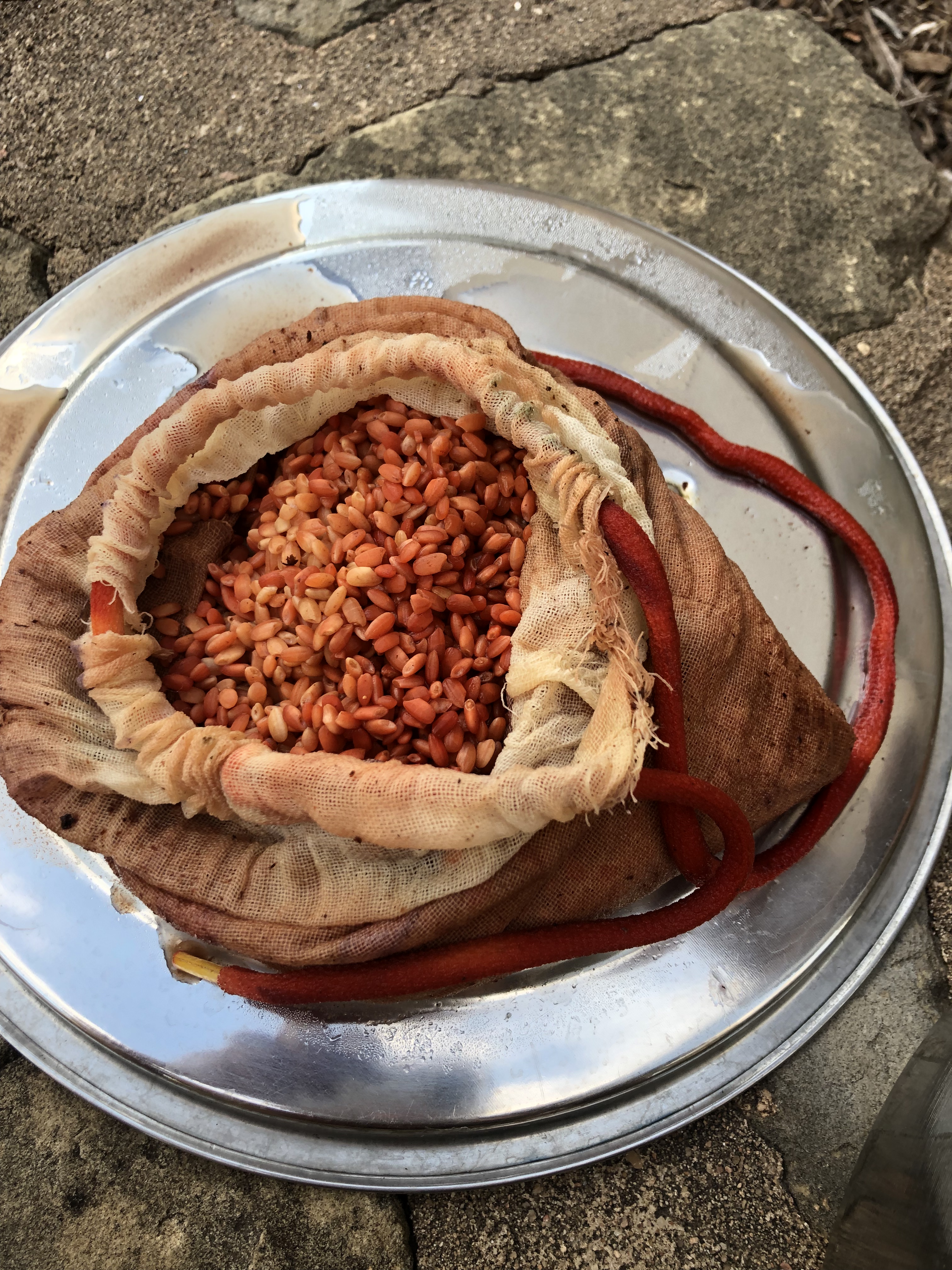I have some garden frames and screens I repurpose every couple of years when I harvest. Below is my frame set up by my water source. I set the sun screen fabric on my garden frames and use it to keep my madder in place as I rinse more dirt off. The madder is moved to another bucket for a 2nd rinse. Of course, these rinse waters are put on meadow plants and other areas outside the irrigation system.