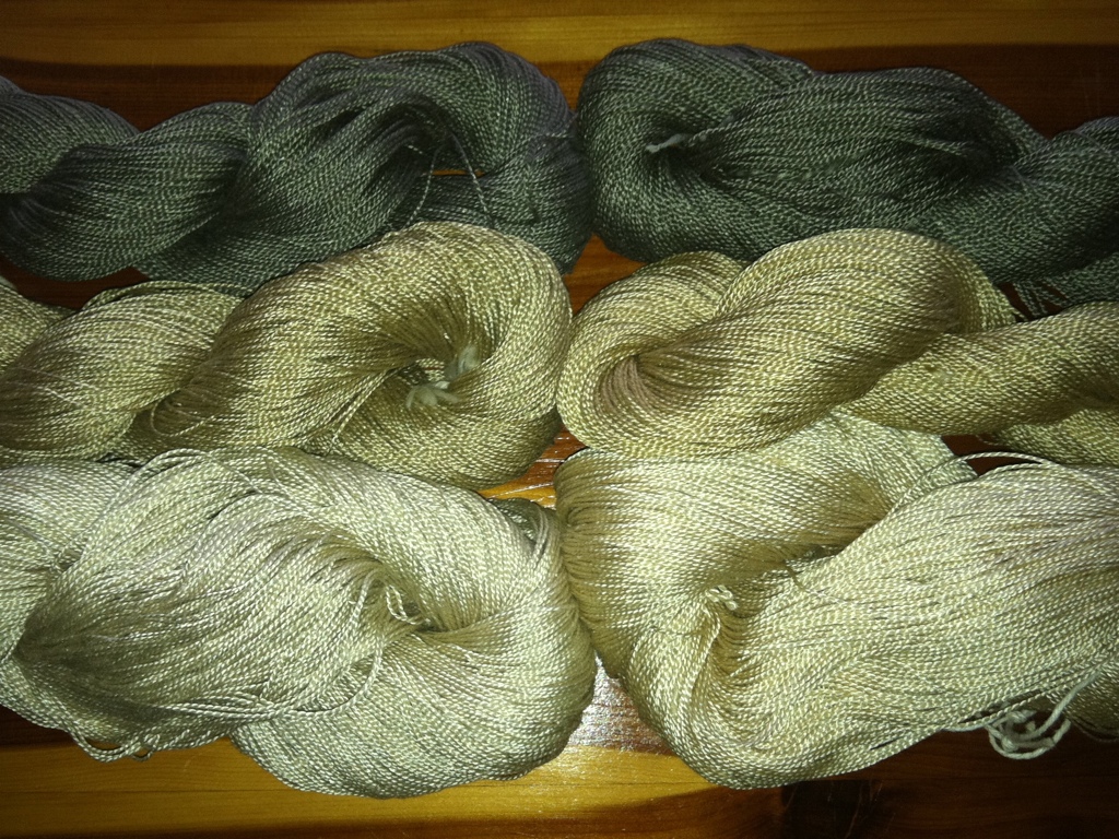 If I were a perfect dyer photographer the labels would read clearly. But in summary I over dyed a series of tannin based beiges. Sorry, in no particular order these skeins were Lichen pulled with DNA, Water soaked oak gall, Lichen pulled with soda ash, green persimmon, lichen extracted with ammonia, Oak bark in water soak, and acorn exhaust. All of these combined will make a great drall scarf. I have plenty of color choices to combine.